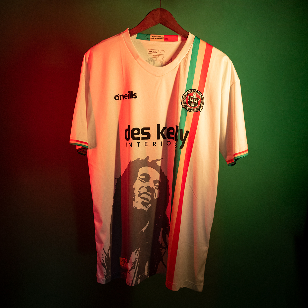 Bohemians Bob Marley Jersey . Designed by O'Neills, this jersey celebrates the connection between Bohemian FC, music, and community spirit The jersey is 100% polyester. It’s breathable and made for a life on the move
